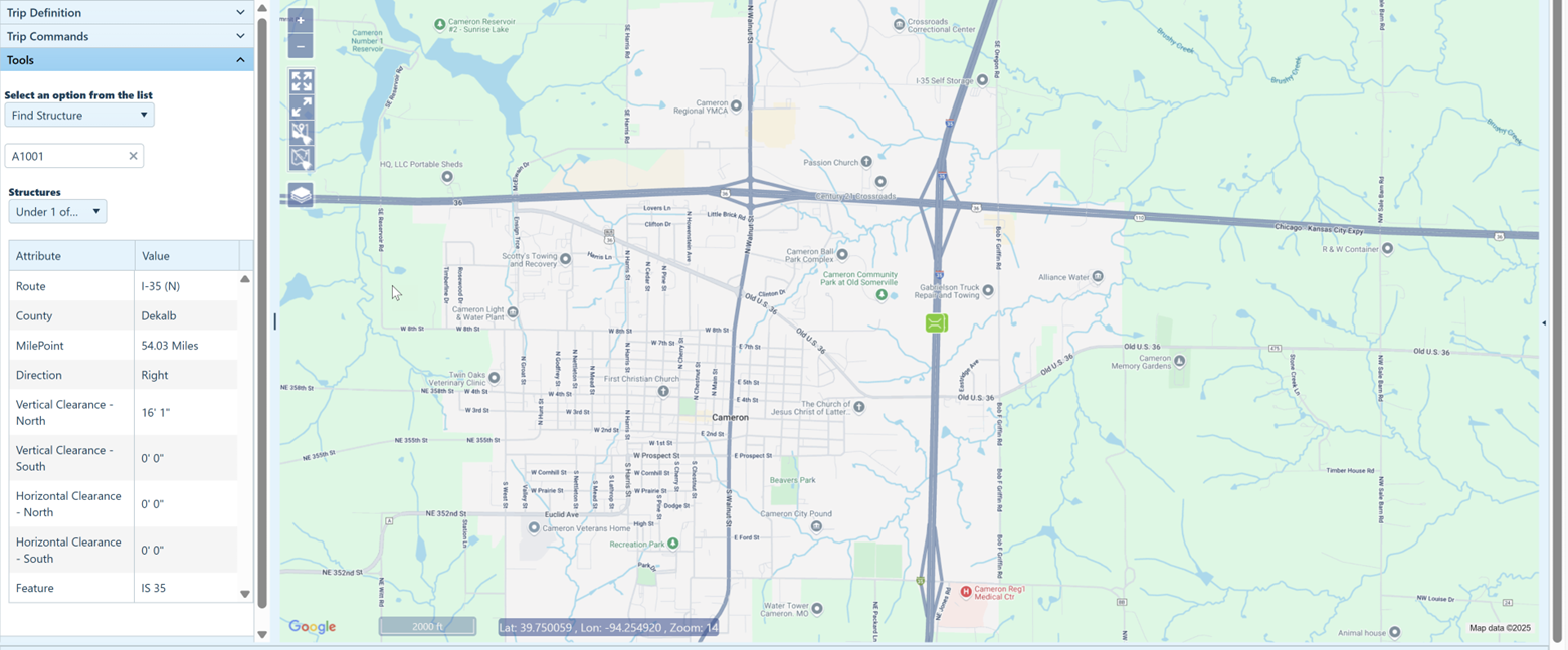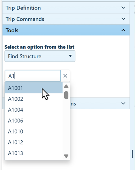With an application open to the Trip page, access the Tools pane, then choose Find structure from the drop-down.