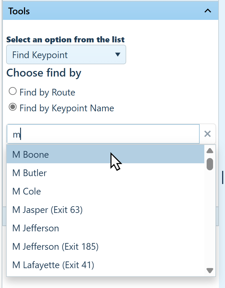 Click the Find by Route radio button if you wish to use a route name to find the keypoint.