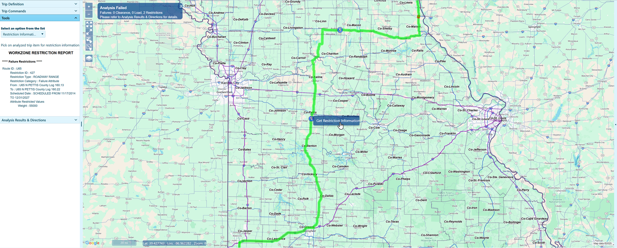 The cursor is now equipped to identify the restriction, so move it over the map and right-click on a red portion of the route then left-click the Get Restriction Information button.